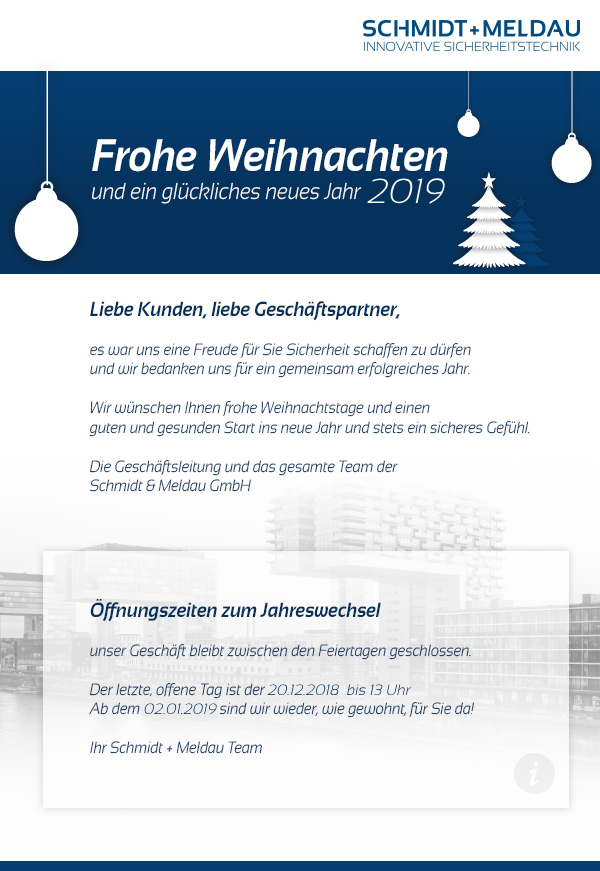 Liebe Kunden, liebe Geschäftspartner, unser Geschäft bleibt zwischen den Feiertagen geschlossen. Der letzte, offene Tag ist der 20.12.2018 bis 13 Uhr. Ab dem 02.01.2019 sind wir wieder, wie gewohnt, für Sie da! Ihr Schmidt + Meldau Team