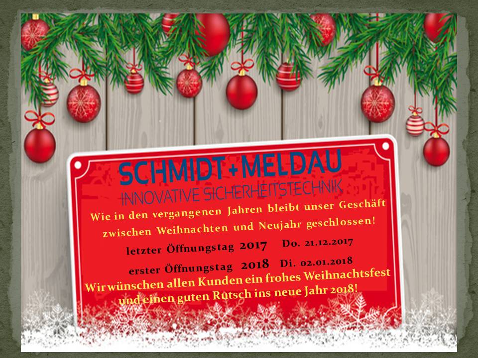 Liebe Kunden, liebe Geschäftspartner, unser Geschäft bleibt zwischen den Feiertagen geschlossen. Der letzte, offene Tag ist der 21.12.2017. Ab dem 02.01.2018 sind wir wieder, wie gewohnt, für Sie da! Ihr Schmidt + Meldau Team