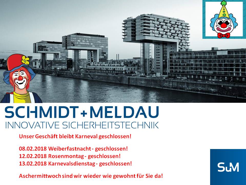 Liebe Kunden und Geschäftspartner, unser Geschäft bleibt an Karneval (08.02.2018, 12.02.2018 & 13.02.2018) geschlossen! Aschermittwoch sind wir wieder wie gewohnt für Sie da! Ihr Schmidt+Meldau Team
